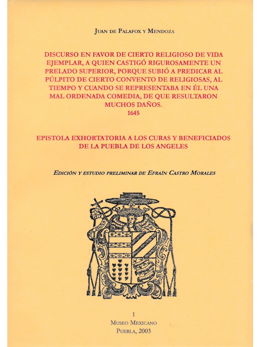 Discurso del ilustrísimo y excelentísimo señor don Juan de Palafox y Mendoza, mi señor (que Dios tiene en su reino) escrito en favor de cierto religioso de vida ejemplar, a quien castigó rigurosamente un prelado superior, porque se subió a predicar al púlpito de cierto convento de religiosas a el tiempo y cuando se representaba en él, una mal ordenada comedia de que resultaron muchos daños. Escribió lo dicho señor el día 16 de septiembre de 1645, en la ciudad de México. Exhortatoria a los curas y beneficiados de la Puebla de los Ángeles. Edición y estudio preliminar de Efraín Castro Morales.